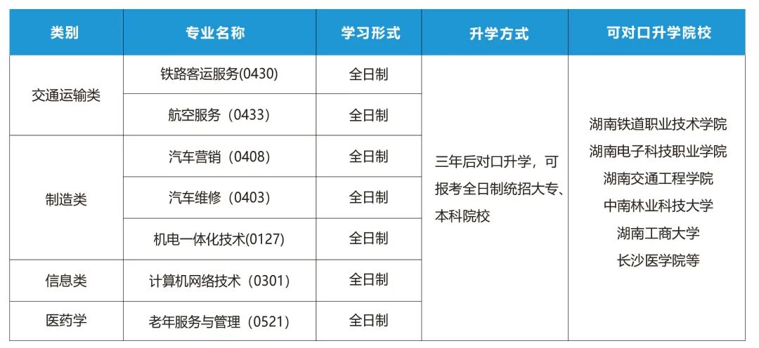 | 交通运输类 | 铁路客运服务(0430) | 全日制 | 三年后对口升学,可 报考全日制统招大专、 本科院校 |