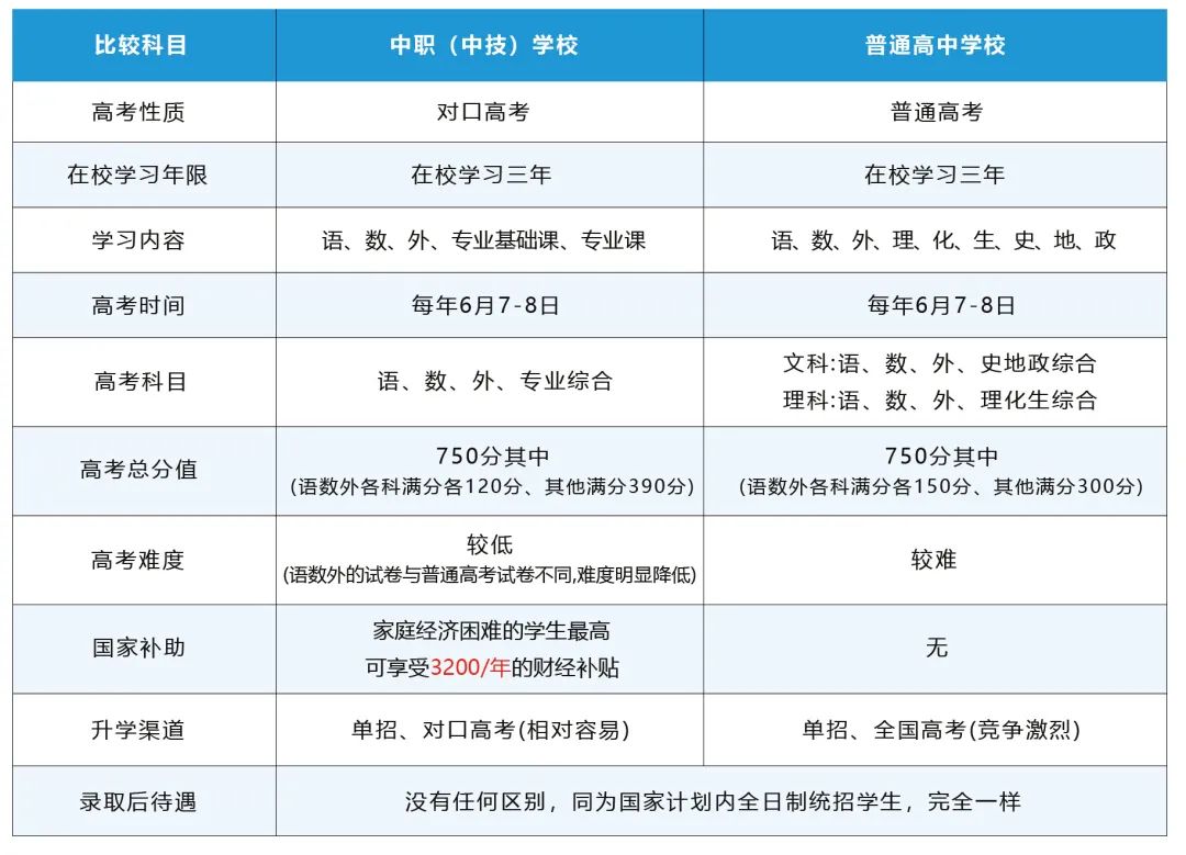 | 升学渠道 | 单招、对口高考(相对容易) | 单招、全国高考(竞争激烈) |